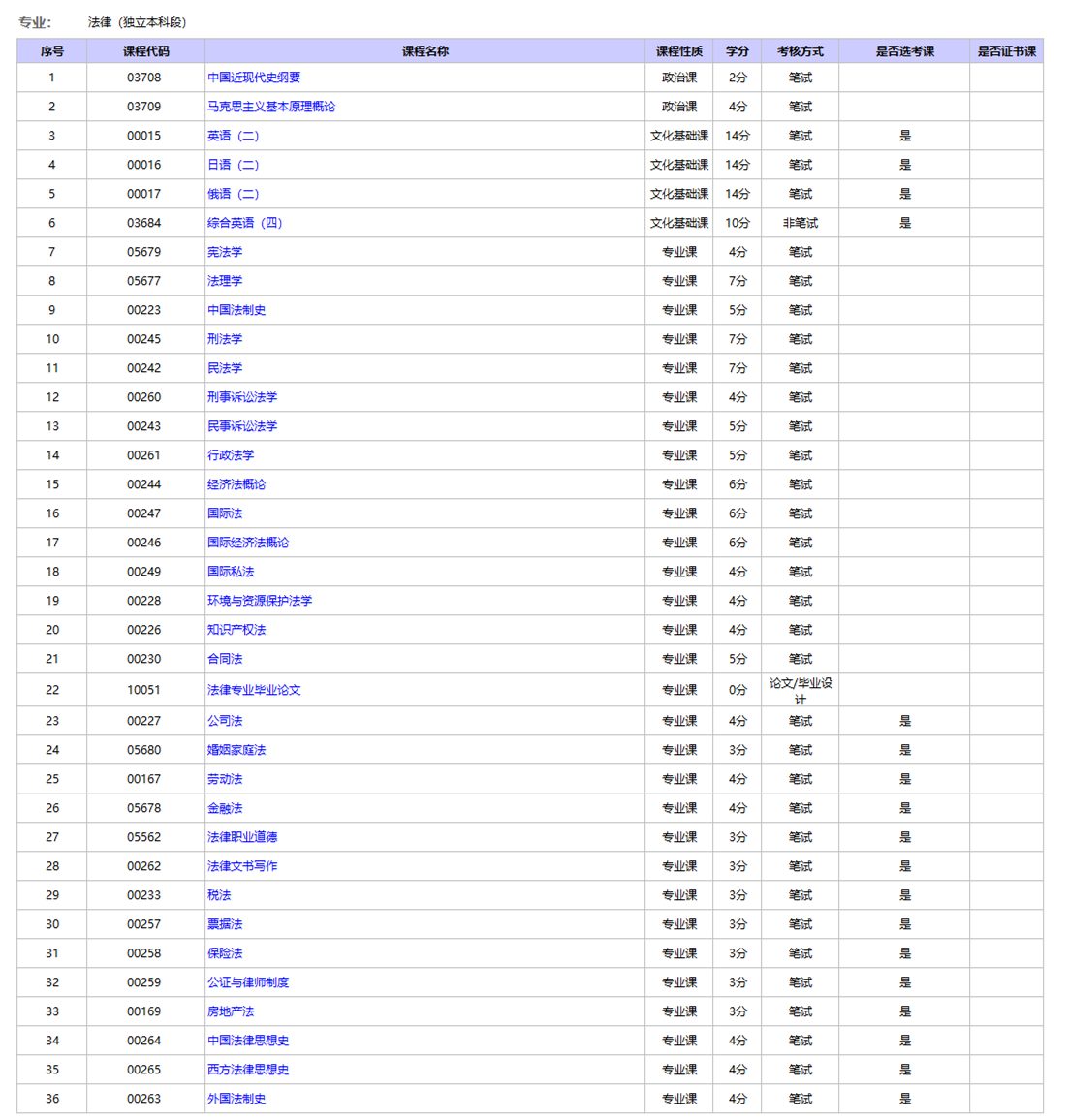 自考法律大学本科难度系数很大,成功率不高。以北京市自考法律大学本科为例子,现有36门课程考?,在其中包含宪法学、法理学、刑法学、民法学、行政法学、国家法、担保法等18门必学课程和音乐(二)、劳动合同法、民法、票据法、保险法、房地产法等18门选考课程,实际如下图所显示: